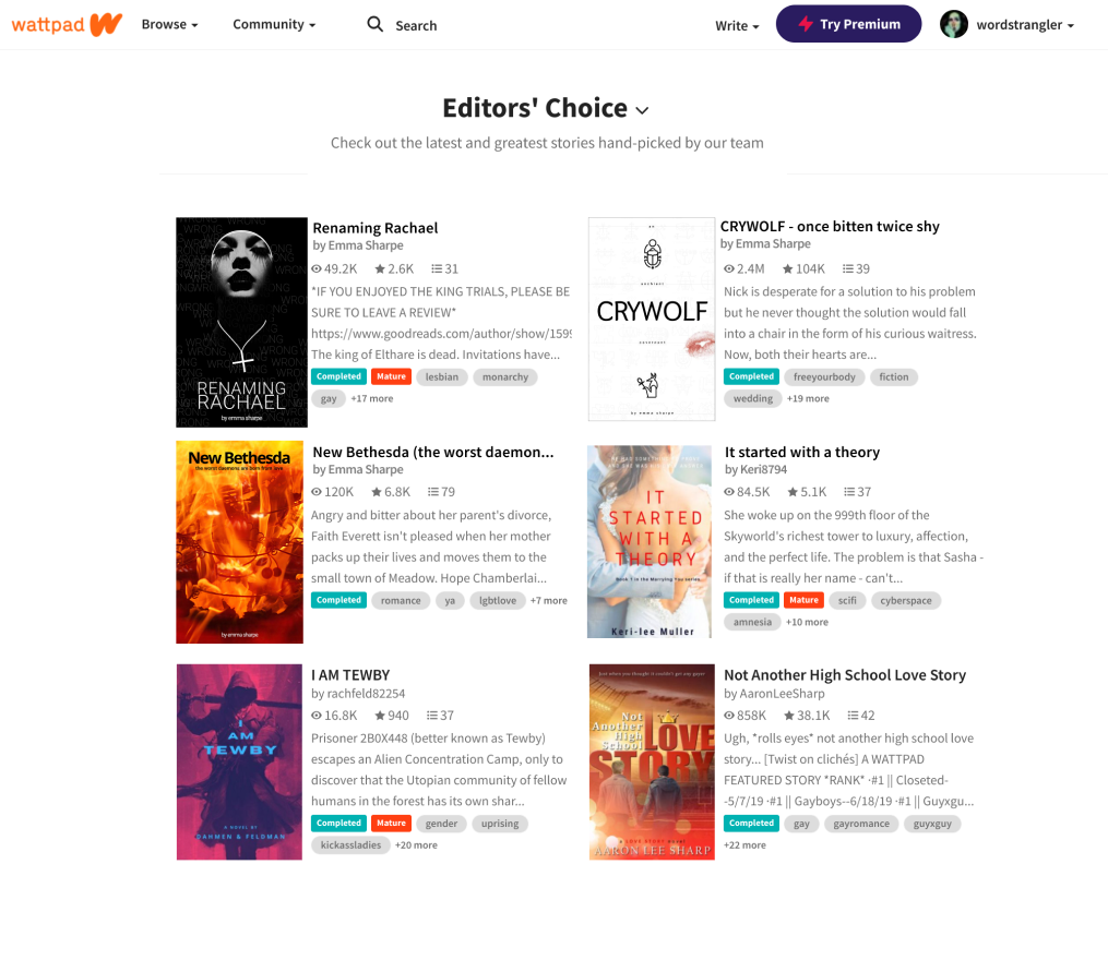 WATTPAD is a free platform for readers and writers specicically focused on content for the YA (young adult) demographic. It's social media publishing for young writers. The brief was to design three covers that "stood out" on the list page.